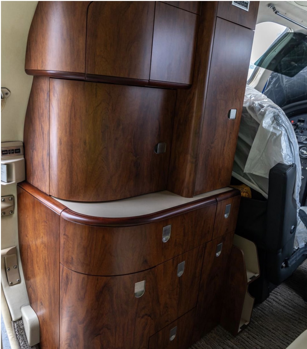 Features a forward galley with storage for beverages, glassware, and waste, and a private aft lavatory separated by brown wooden pocket doors.